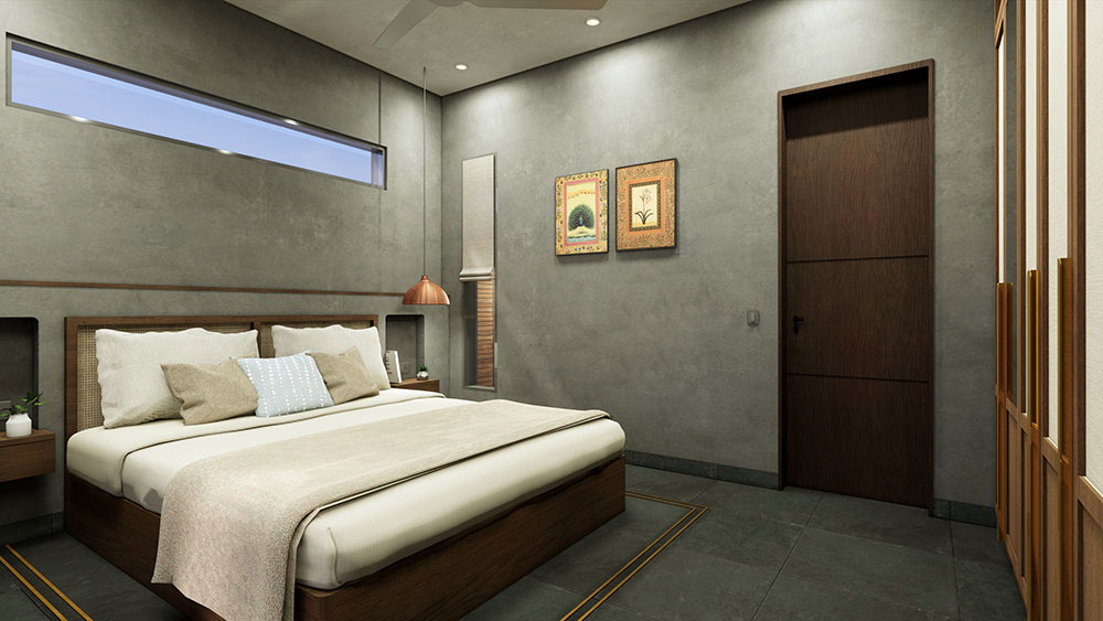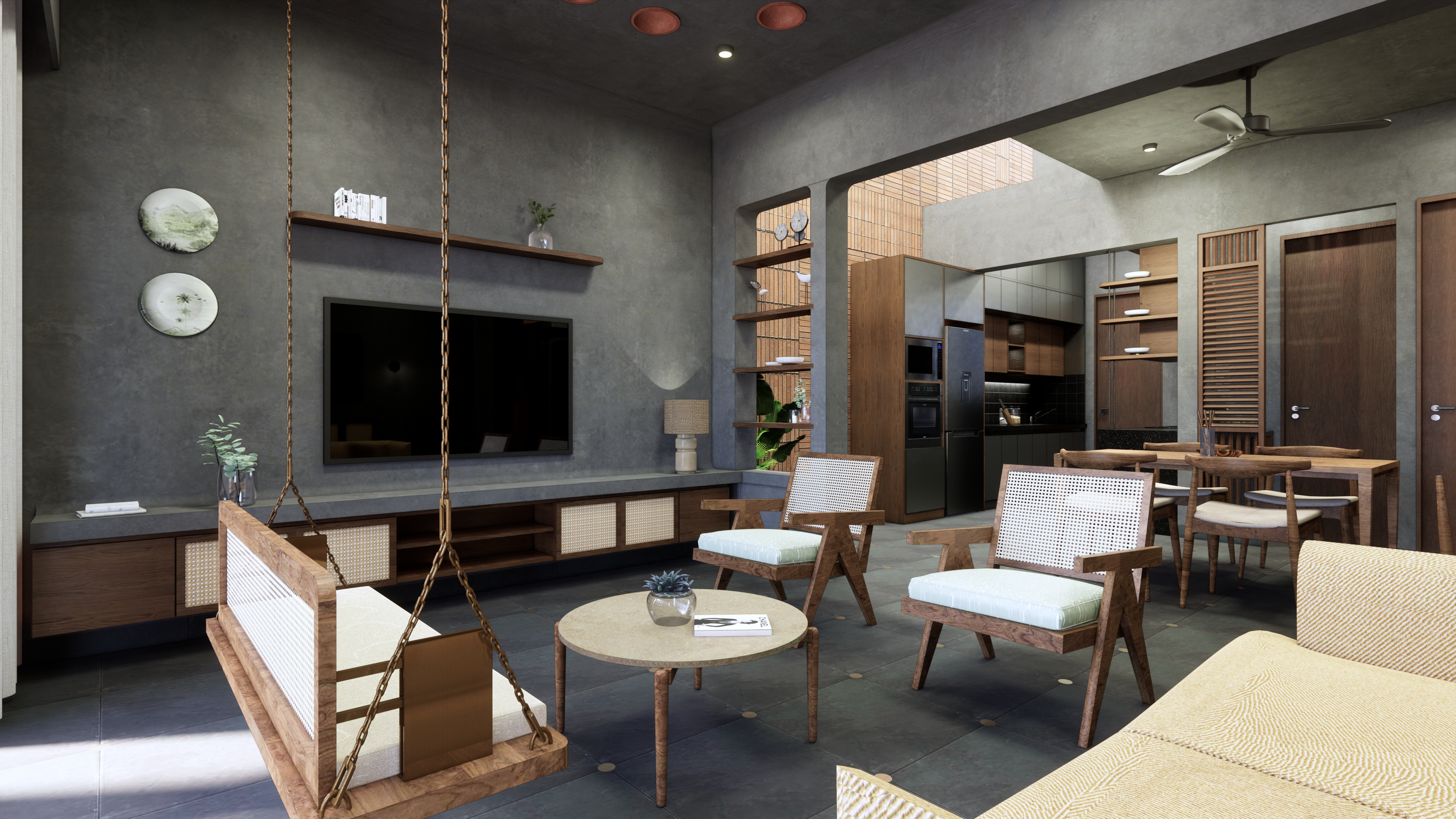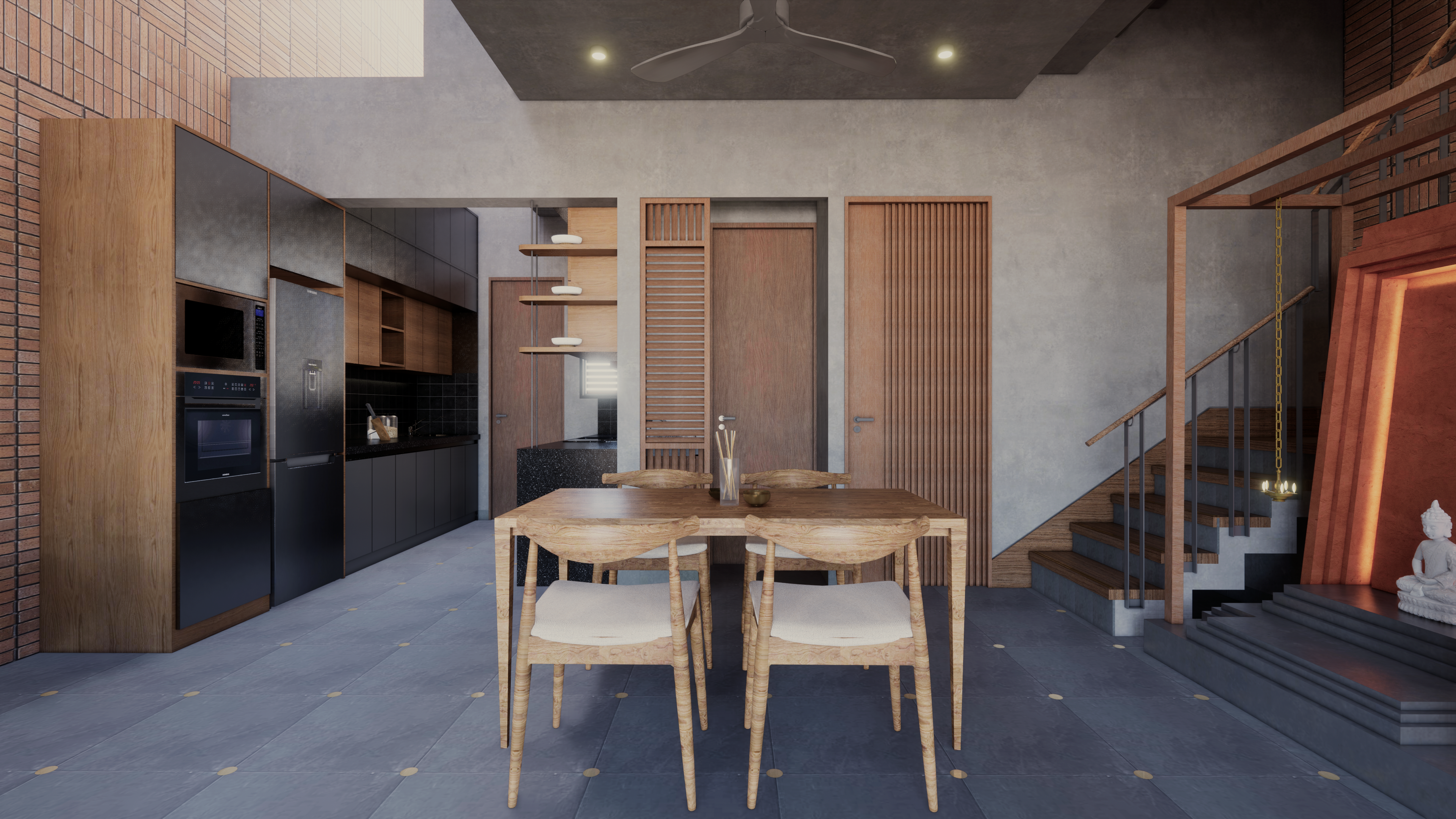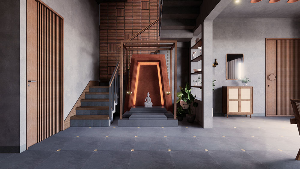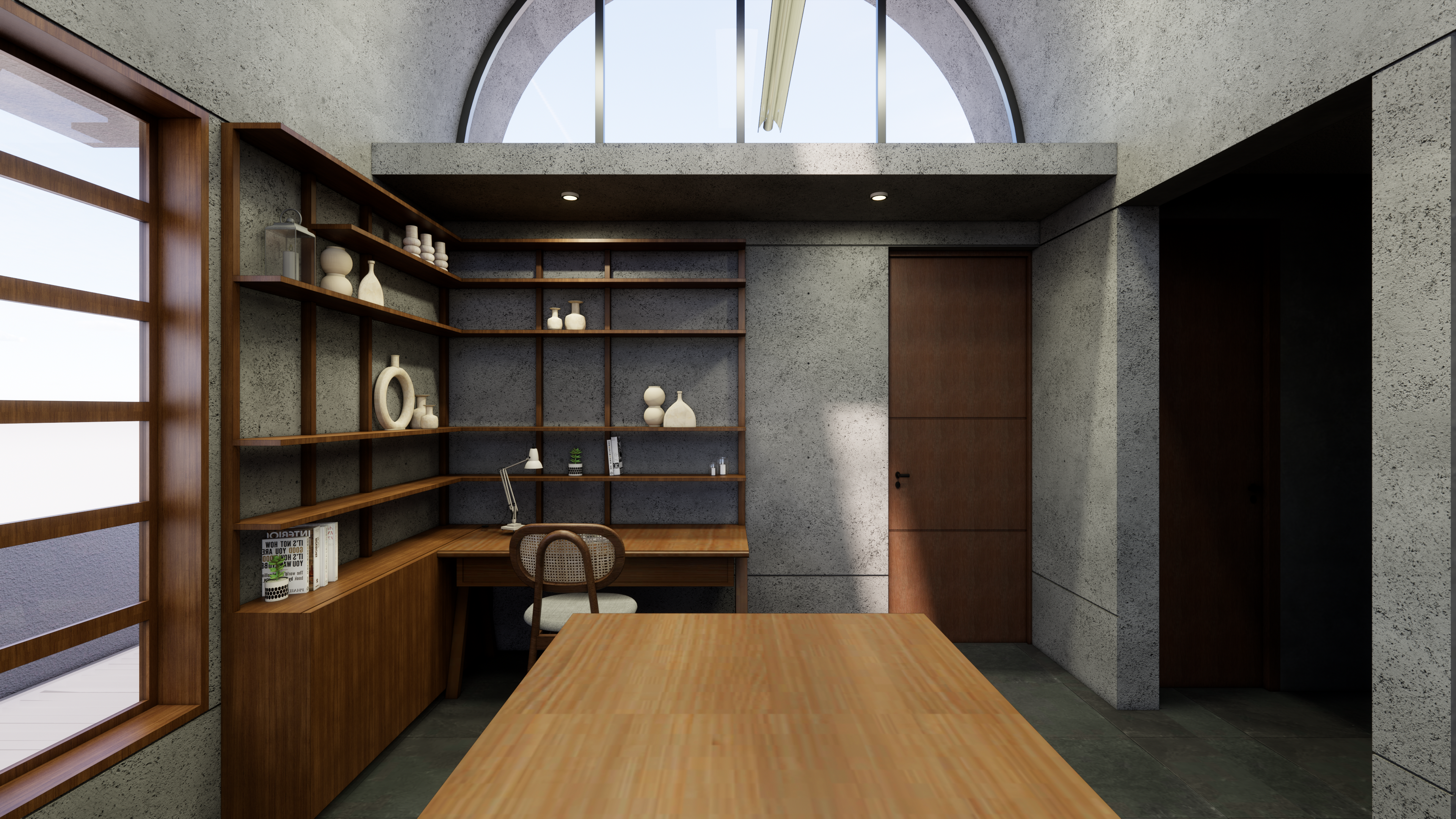 The ongoing Rajajinagar house project embodies an artisan’s vision, characterized by predominantly grey and red tons of concrete and brick. Despite spatial limitations, the design prioritizes a sense of spaciousness, achieved through strategic manipulation of scale and volume. Double-height spaces and a vaulted ceiling create visual interest and amplify the perception of openness within the confines of the structure. By skillfully integrating architectural elements that maximize verticality and depth, the house transcends its physical constraints, offering an expansive and dynamic living environment that celebrates the craft of architecture while embracing the constraints of its urban context.