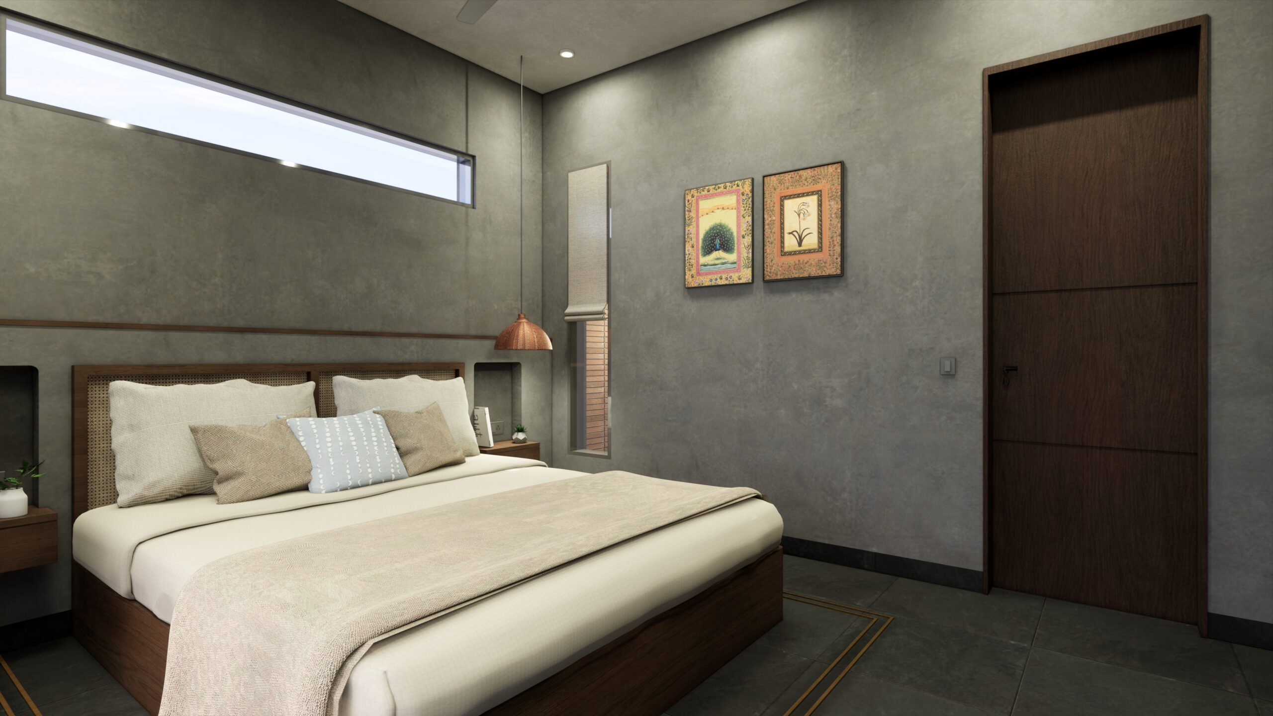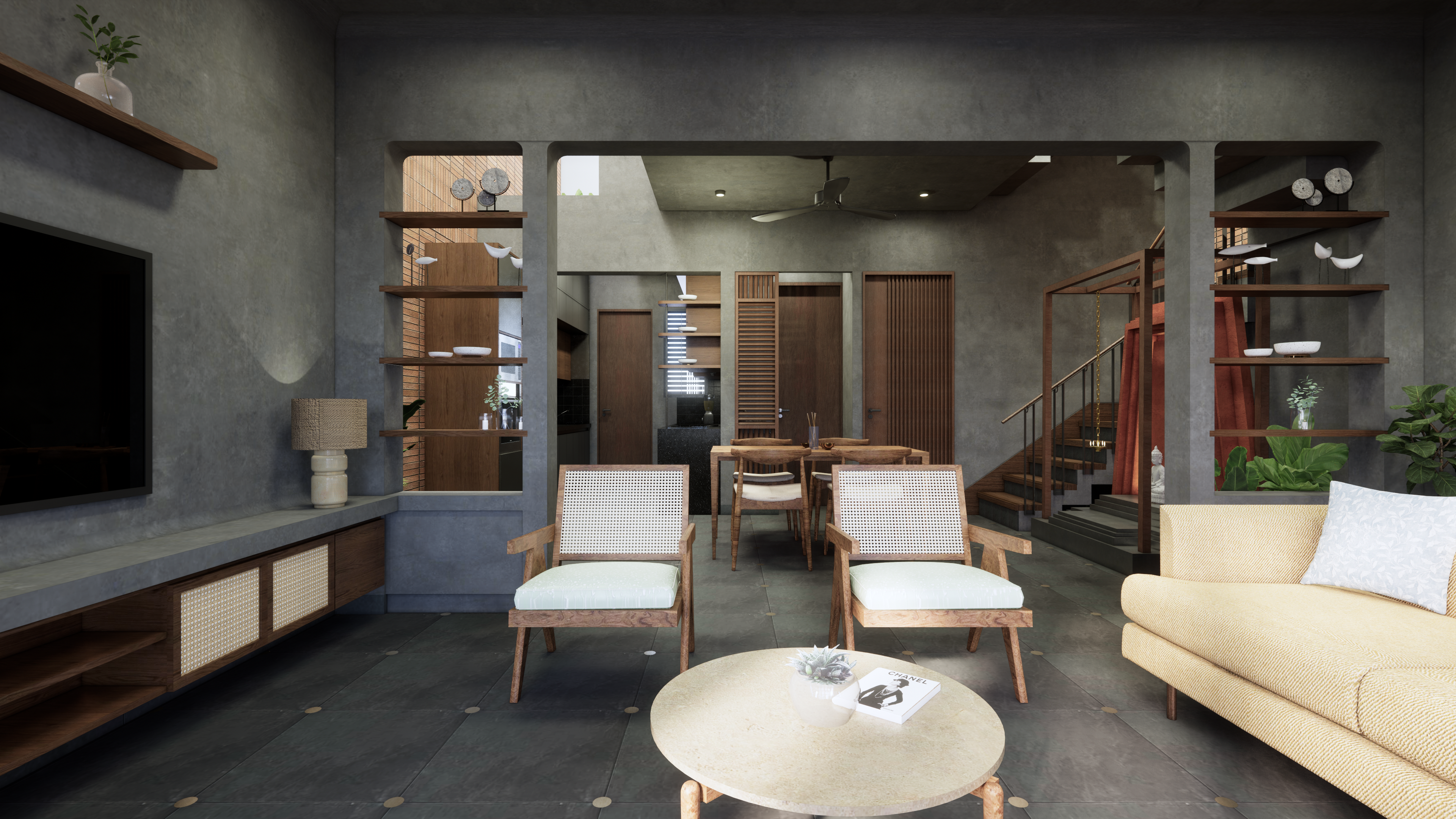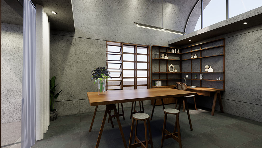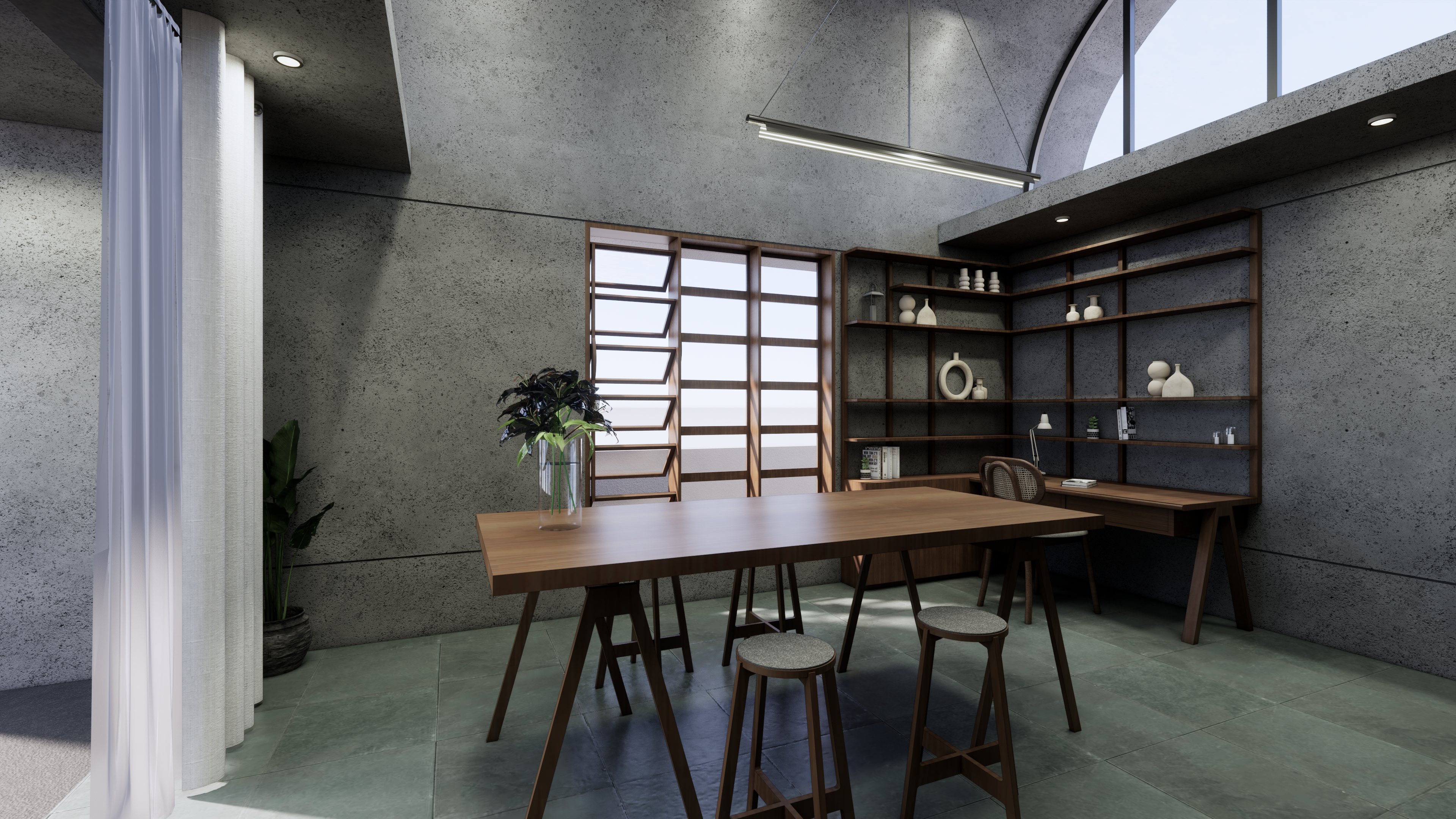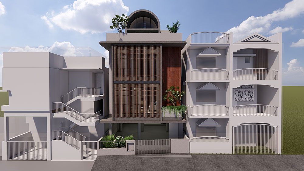 The ongoing Rajajinagar house project embodies an artisan’s vision, characterized by predominantly grey and red tons of concrete and brick. Despite spatial limitations, the design prioritizes a sense of spaciousness, achieved through strategic manipulation of scale and volume. Double-height spaces and a vaulted ceiling create visual interest and amplify the perception of openness within the confines of the structure. By skillfully integrating architectural elements that maximize verticality and depth, the house transcends its physical constraints, offering an expansive and dynamic living environment that celebrates the craft of architecture while embracing the constraints of its urban context.