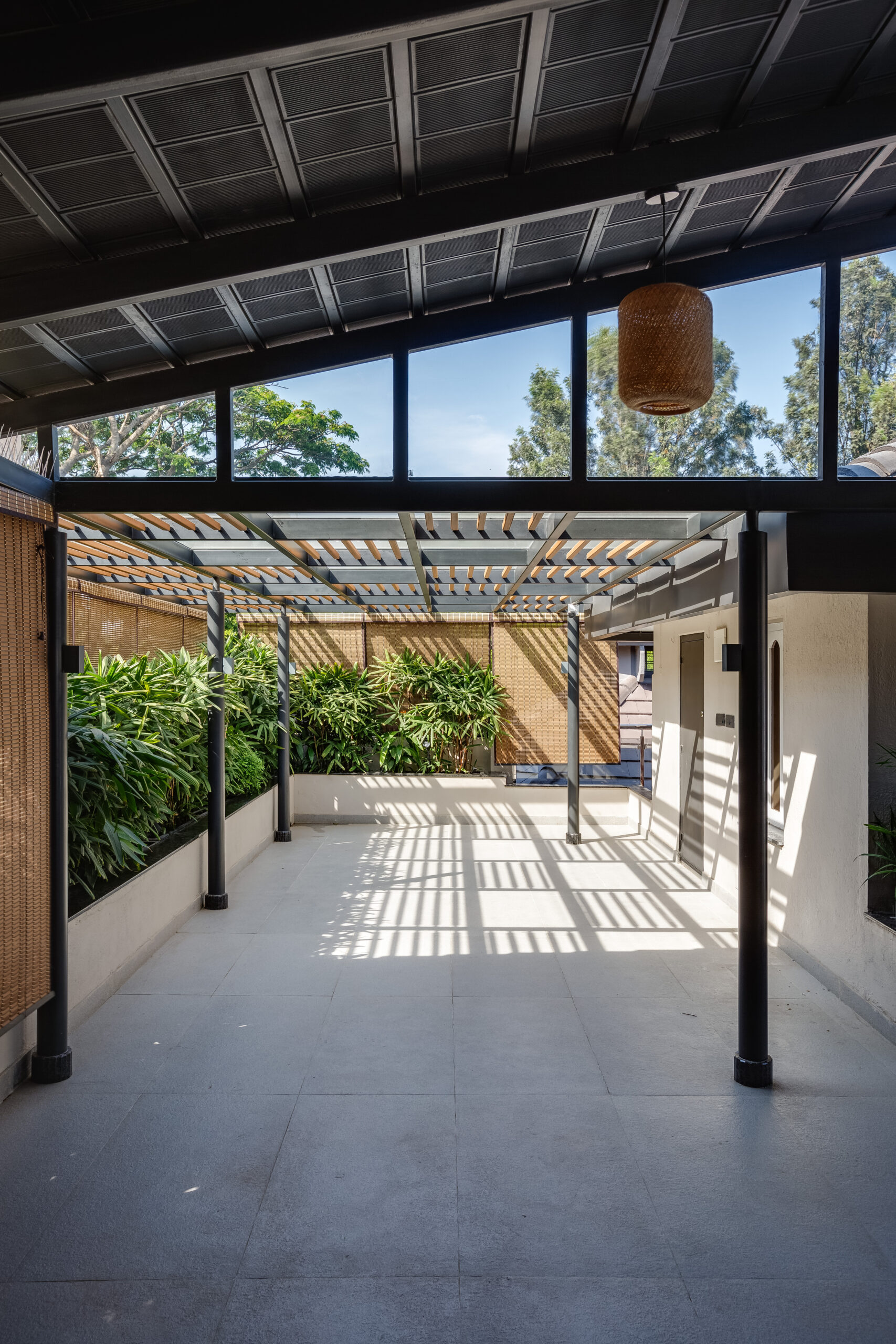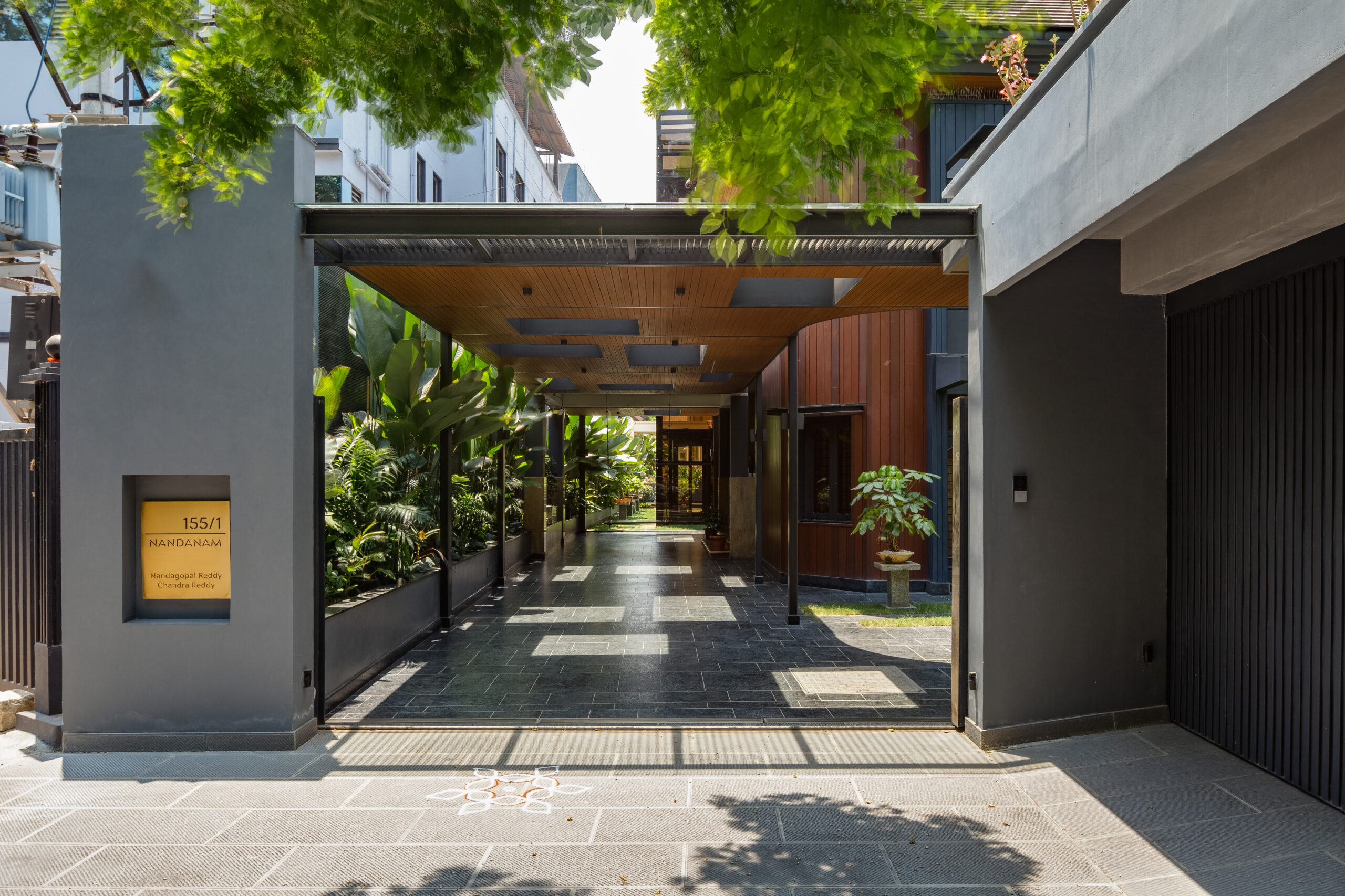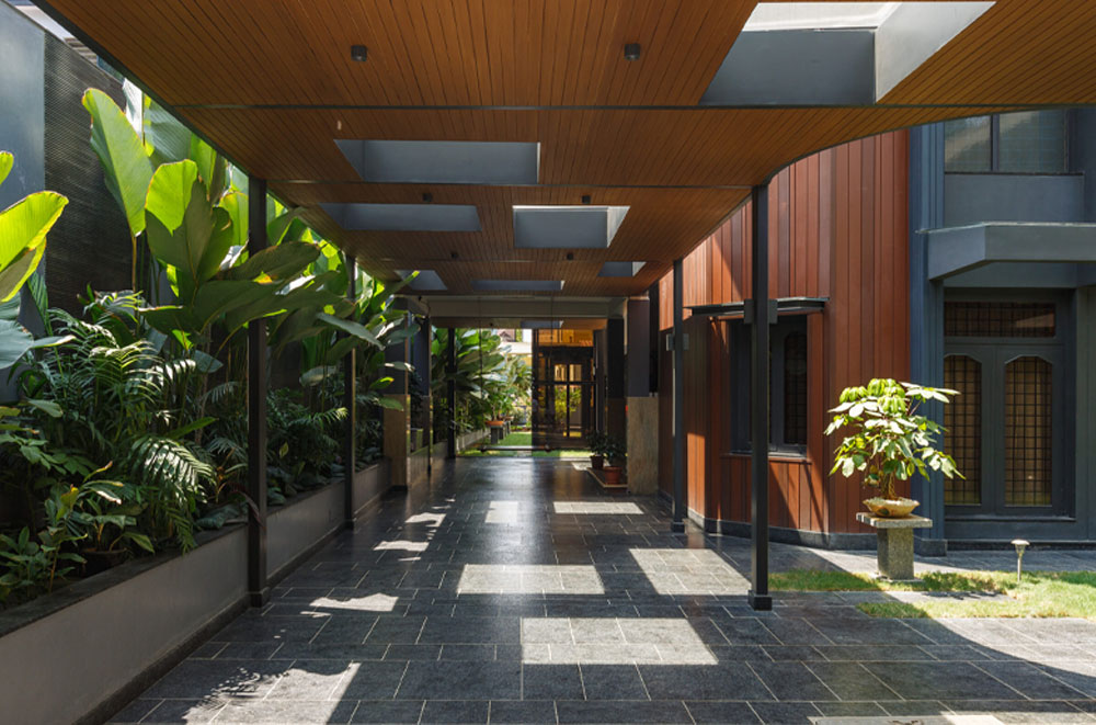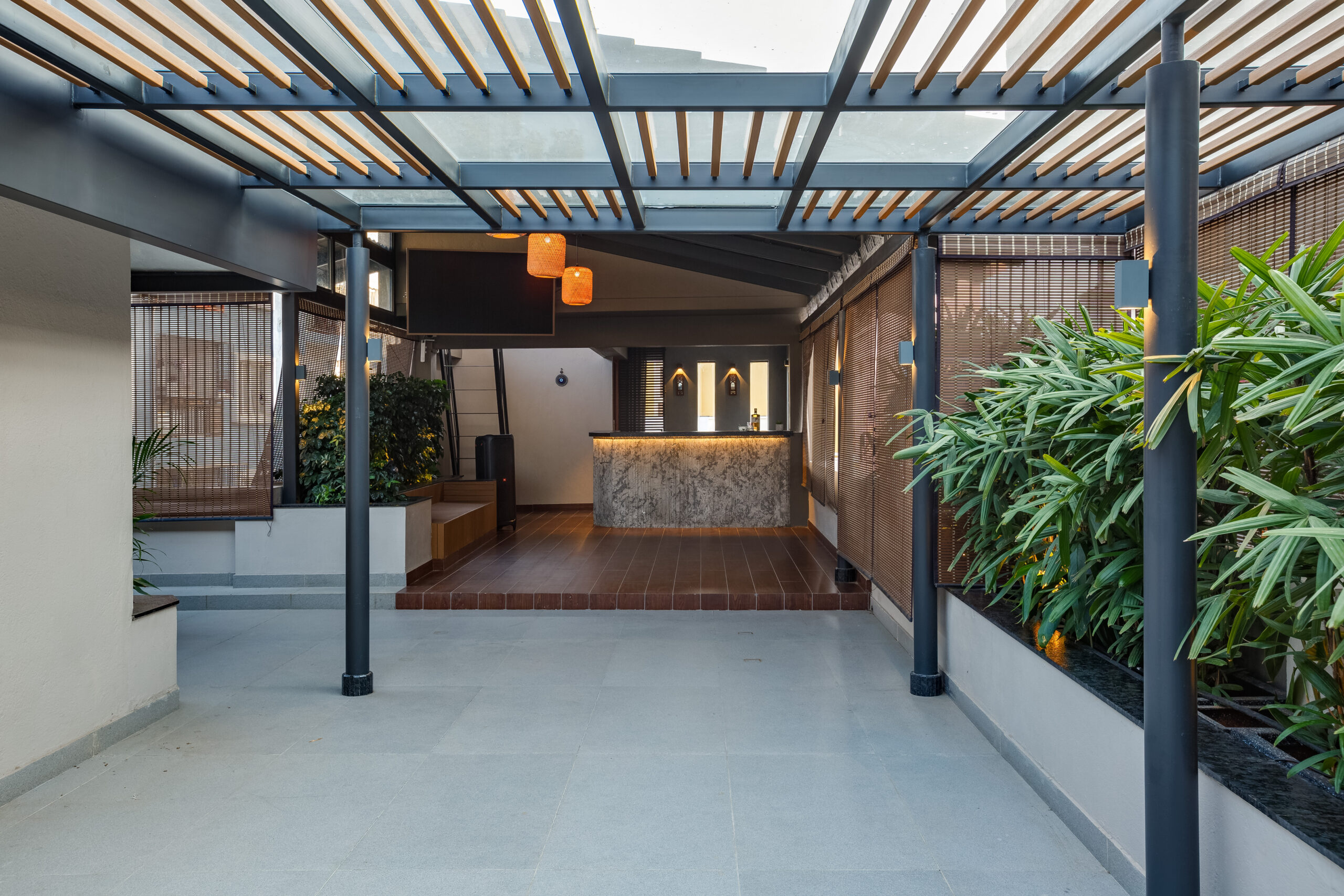 CR Residence in Domlur boasts a striking entrance pergola with relwood cladding supported by steel frames, exuding aesthetic appeal. The facade, adorned with red aluminum panels, delivers a bold statement. Seamless integration of interior and exterior spaces allows for smooth flow, accentuated by abundant greenery. Expansive glass windows enhance spatial... Read More