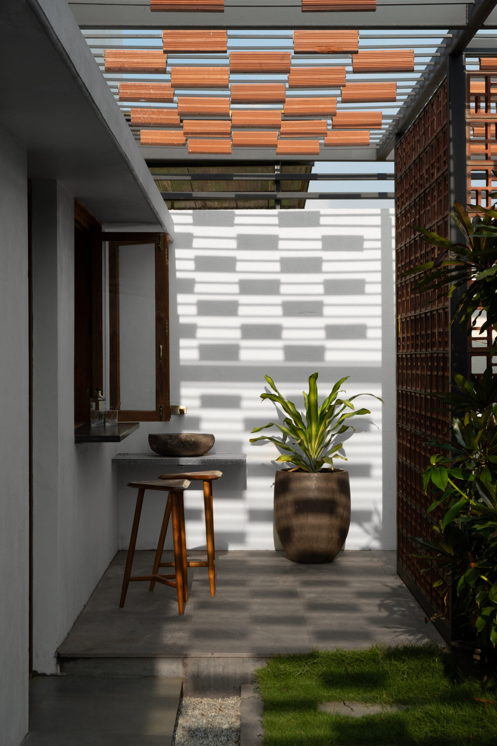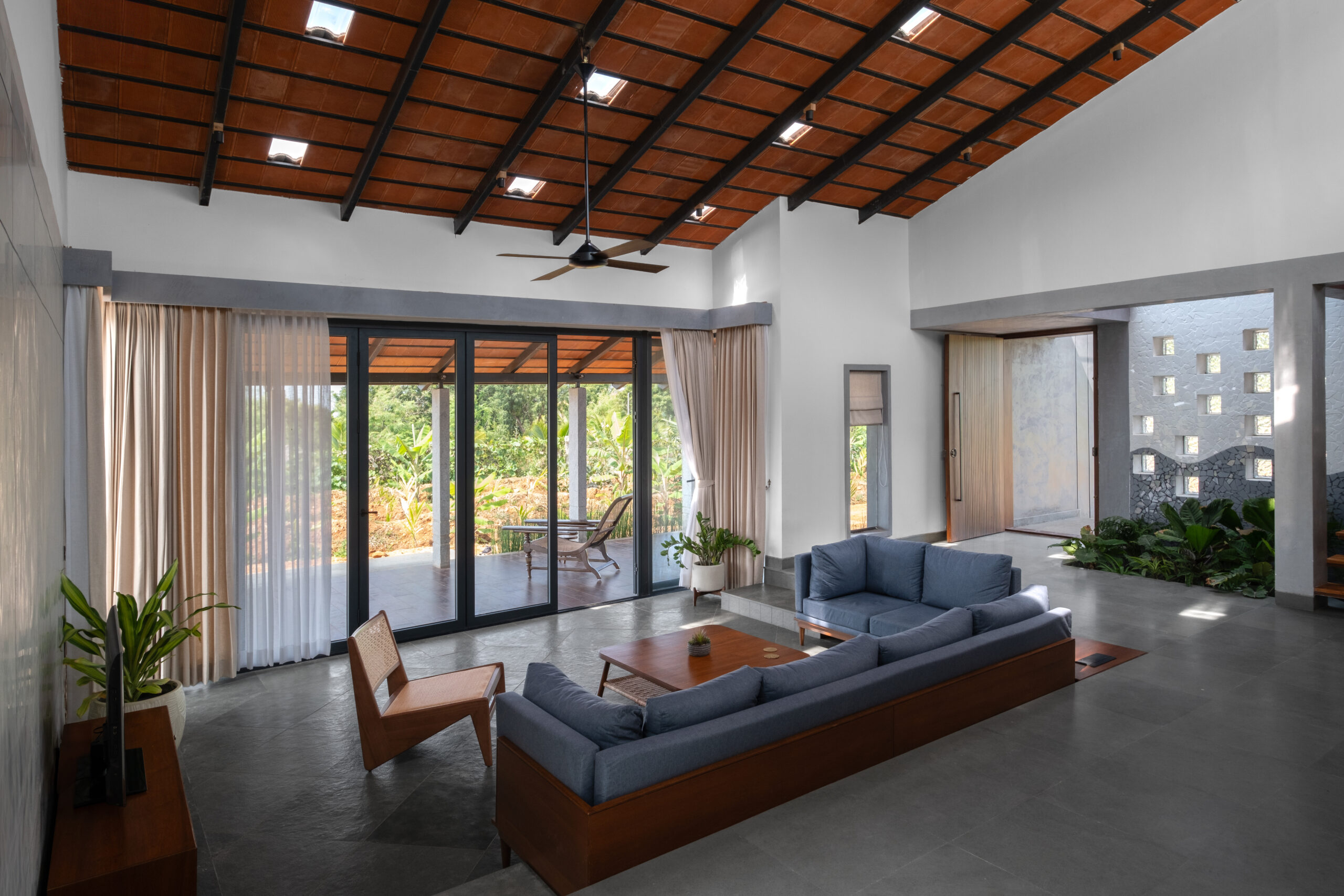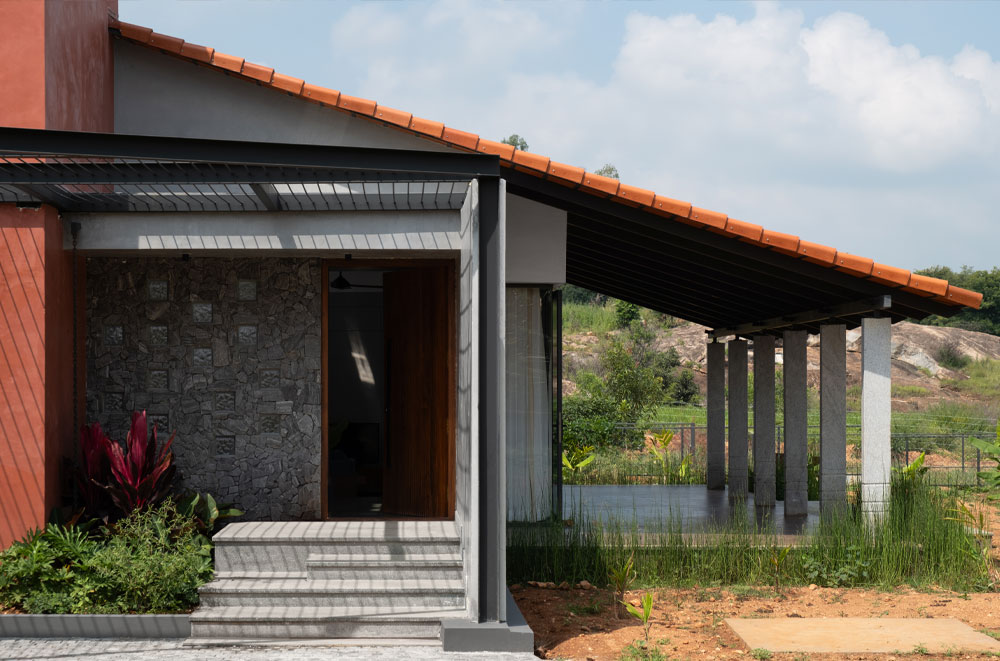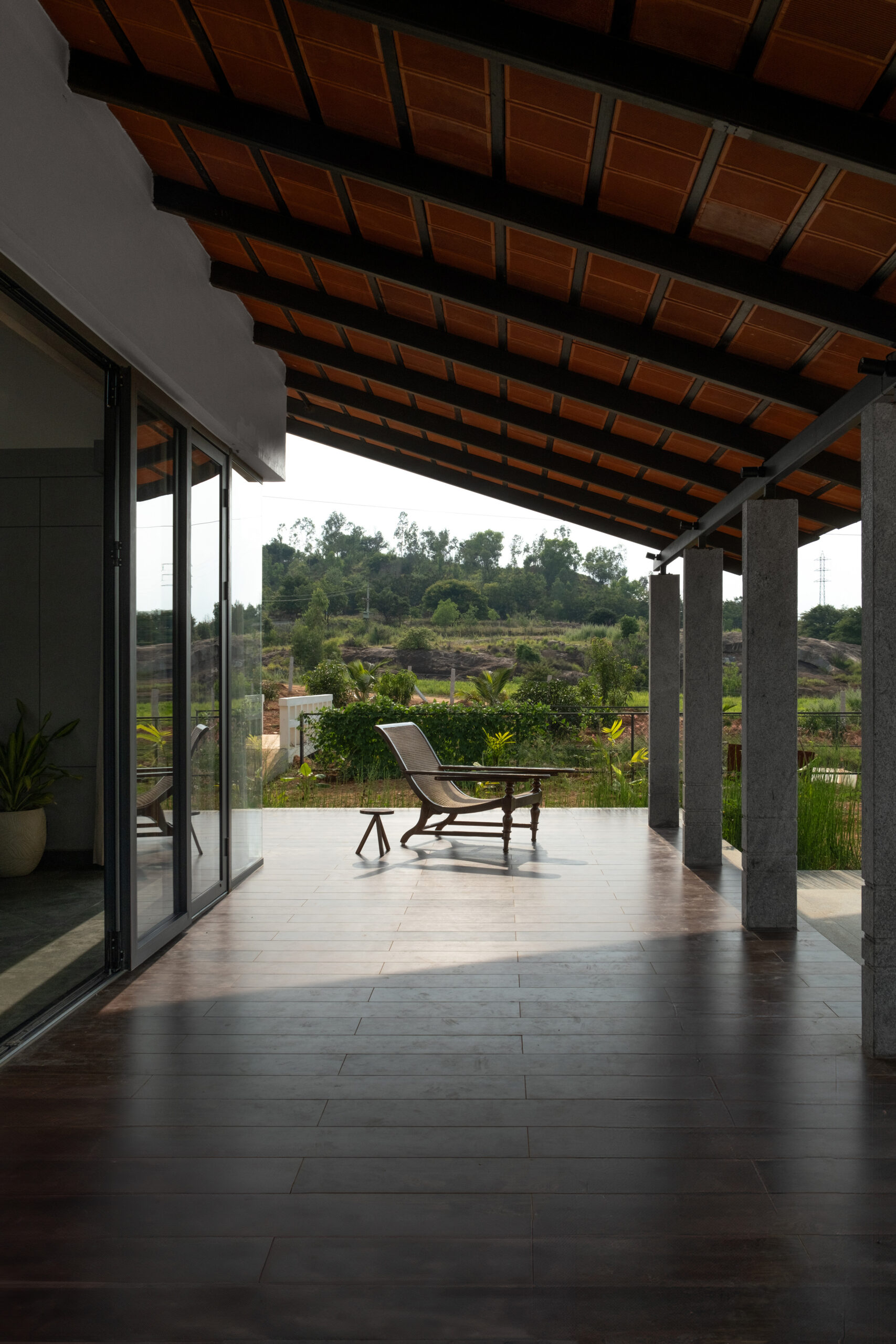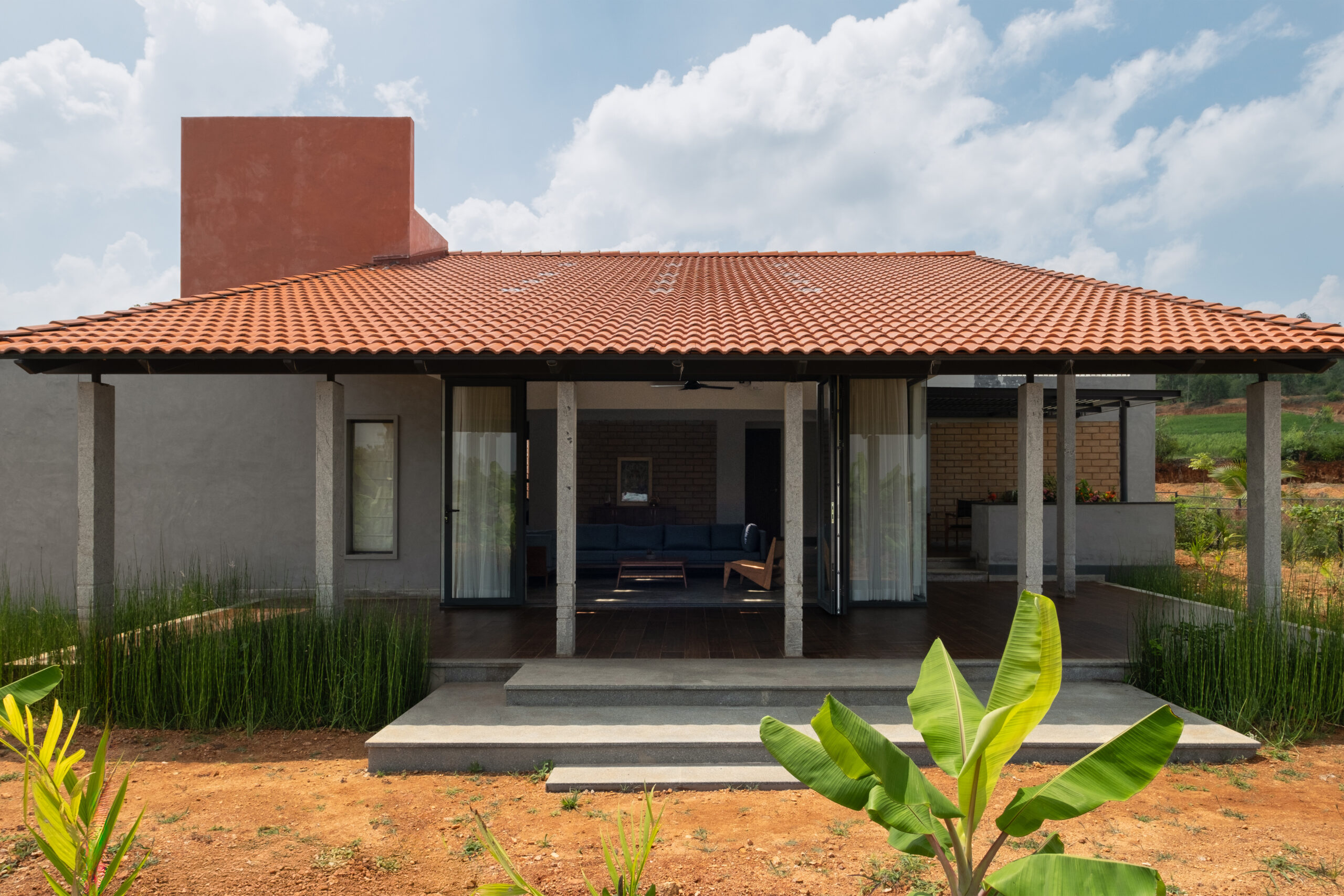 Nestled amidst the picturesque agricultural landscape on the outskirts of Bangalore, this holiday home epitomizes contemporary luxury blended seamlessly with traditional charm. Designed with a focus on space and natural surroundings, the minimalist aesthetic accentuates the beauty of the landscape. A serene courtyard beckons from the corridor and living area, adorned with classic paver tiles and lush greenery. Inside, traditional elements like Mangalore tiles and terracotta tones harmonize with modern interior touches, creating a timeless ambiance. The living and dining areas exude sophistication, with step-down seating, stone-clad walls, and sleek wooden accents, offering an inviting retreat for the urban family.