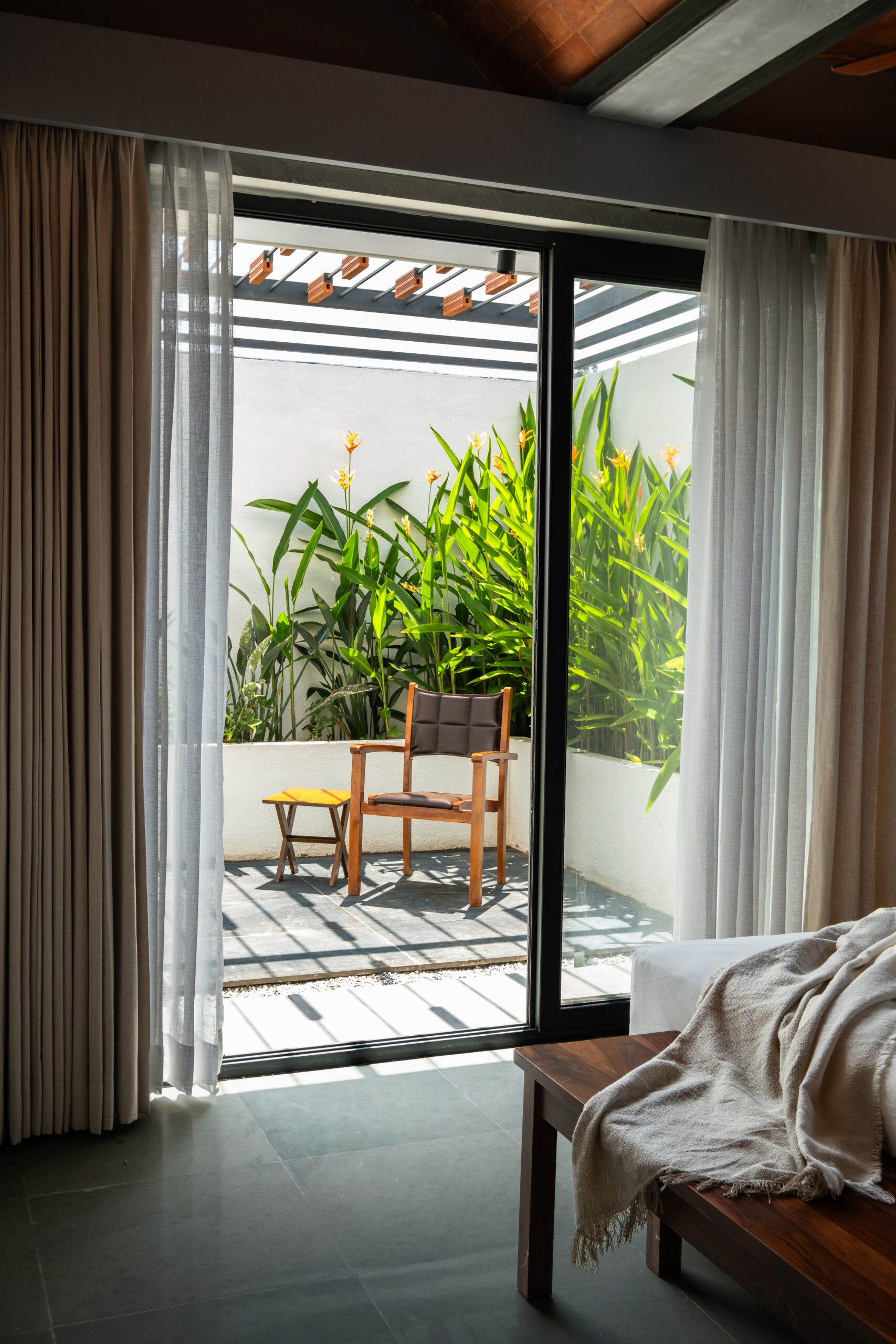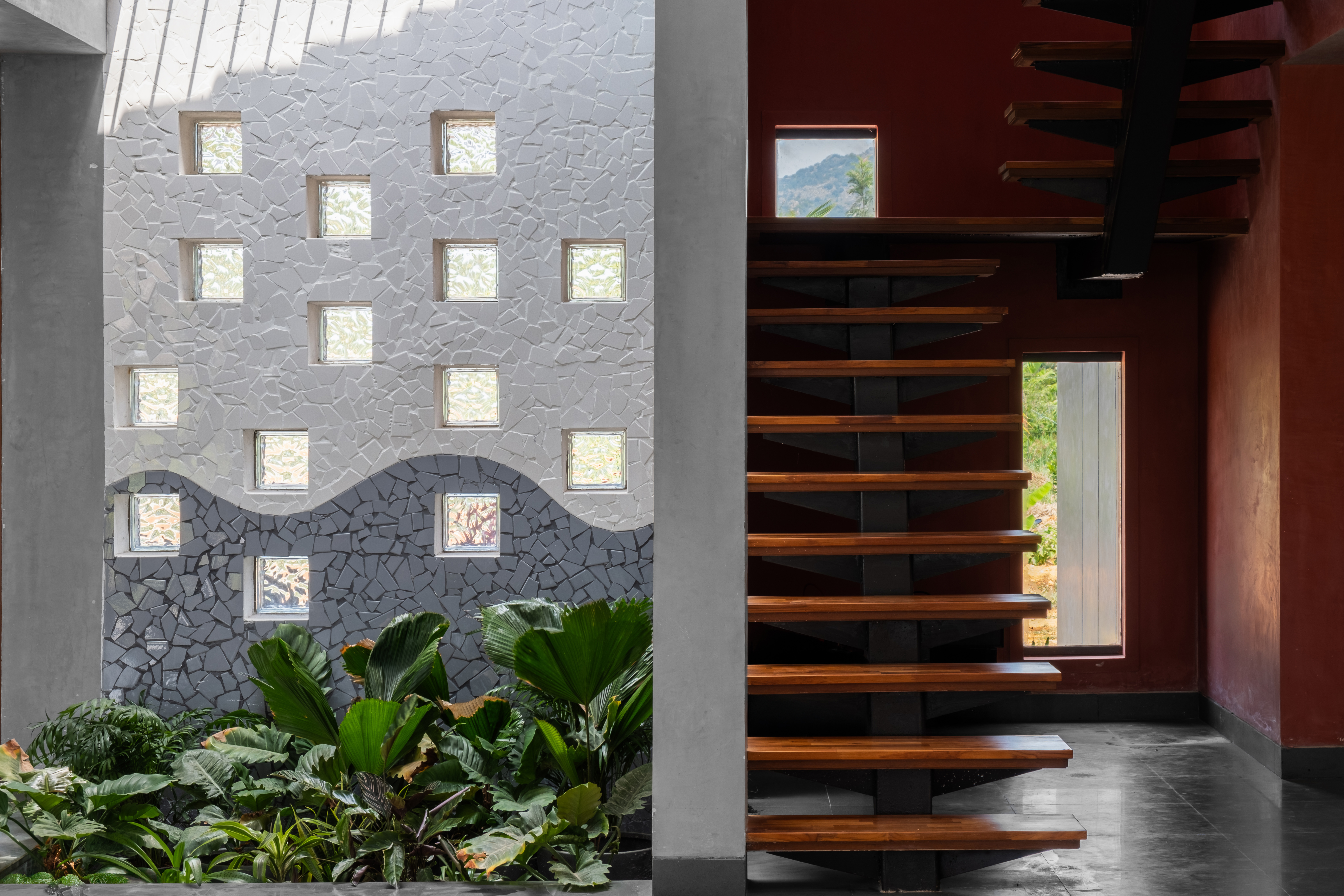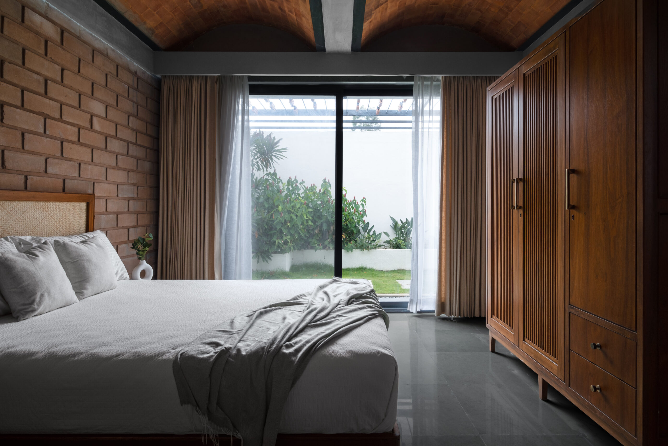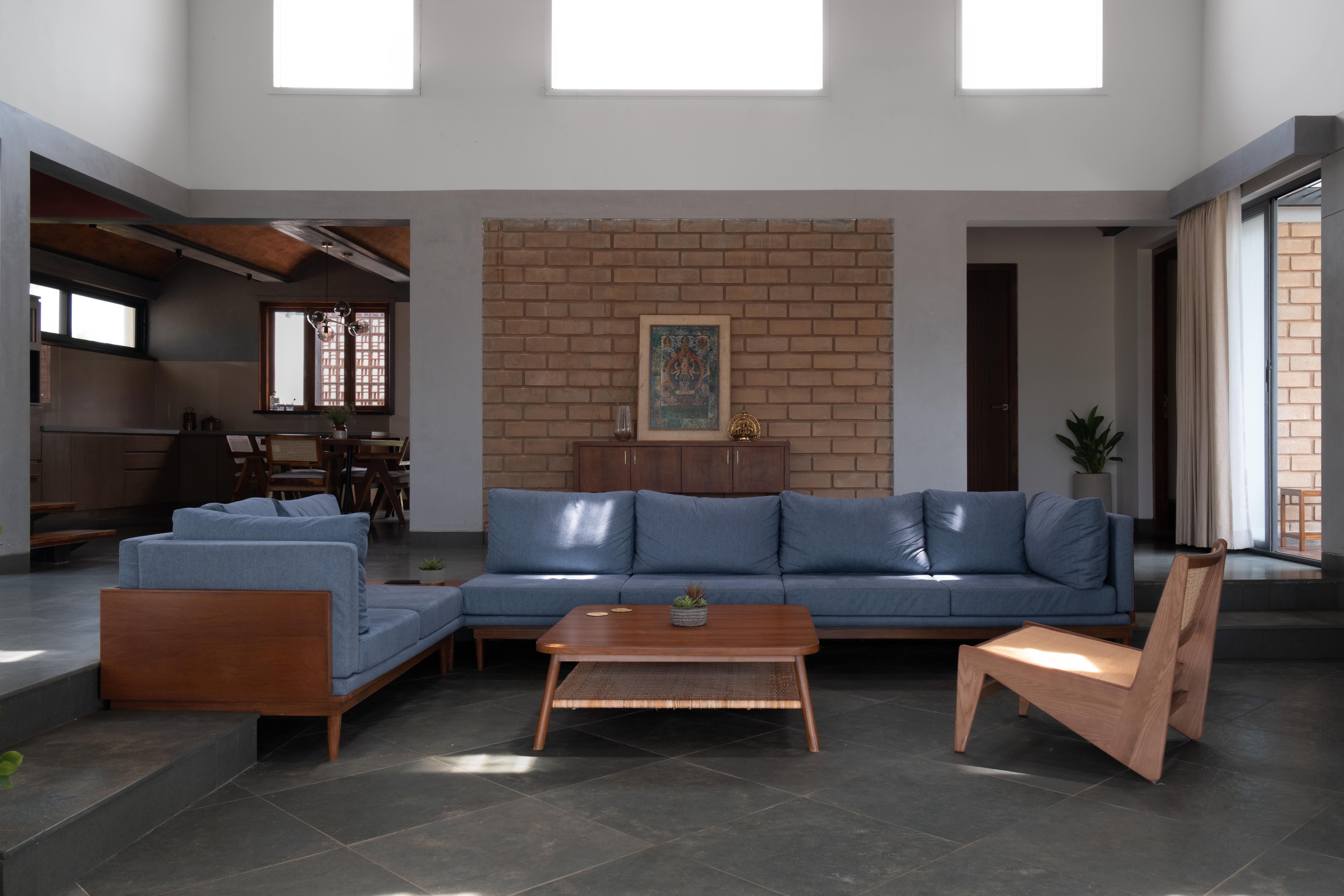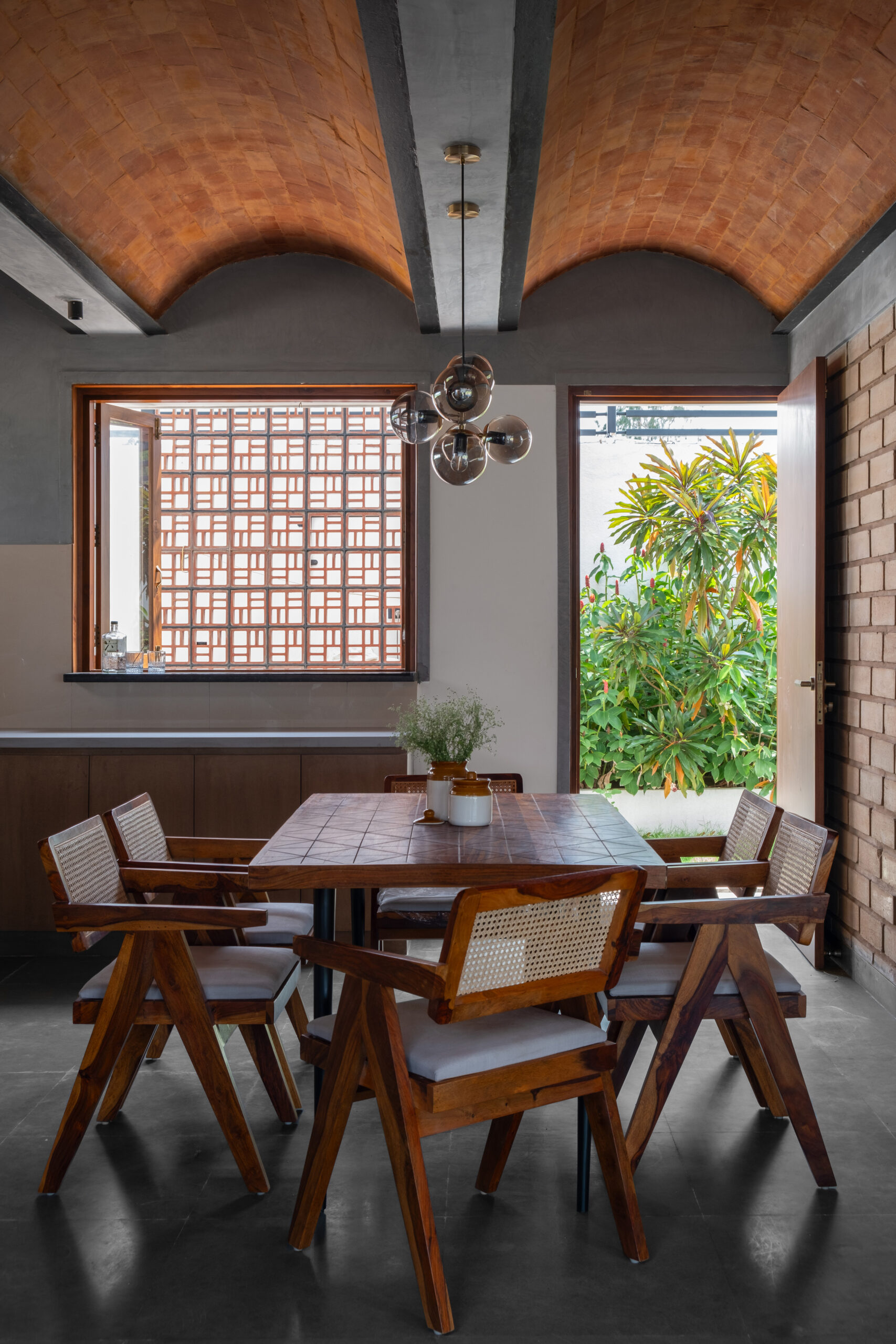 Nestled amidst the picturesque agricultural landscape on the outskirts of Bangalore, this holiday home epitomizes contemporary luxury blended seamlessly with traditional charm. Designed with a focus on space and natural surroundings, the minimalist aesthetic accentuates the beauty of the landscape. A serene courtyard beckons from the corridor and living area, adorned with classic paver tiles and lush greenery. Inside, traditional elements like Mangalore tiles and terracotta tones harmonize with modern interior touches, creating a timeless ambiance. The living and dining areas exude sophistication, with step-down seating, stone-clad walls, and sleek wooden accents, offering an inviting retreat for the urban family.